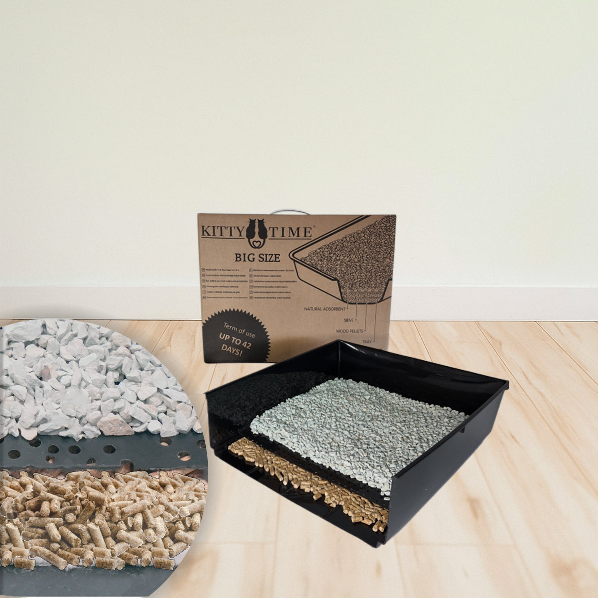 Kitty Time® Profesionālais nomaināmais tualetes komplekts sastāv no paplātes, kuras apakšā atrodas daudzslāņu absorbējošs spilvens priekš Junior Kitty Time, bet Big Size Kitty Time īpaša konstrukcija, virs kura ir augstākās klases skujkoku granulu slānis, kas absorbē urīnu un dezinficē dabisko īpašību dēļ. Nākamais nāk sadalīšanas siets, kas sadala zemākos absorbējošos slāņus, no augšējā slāņa. Augšējais slānis ir dabisks adsorbents, kas atdala dzīvnieka cietos izkarnījumus no zemāk esošajiem slāņiem to efektīvai likvidēšanai, kā arī absorbē un attīra gaisu no nevēlajām smakām. Dabīgais adsorbents - pilnīgi drošs un pat lietojams pārtikas piedevās.